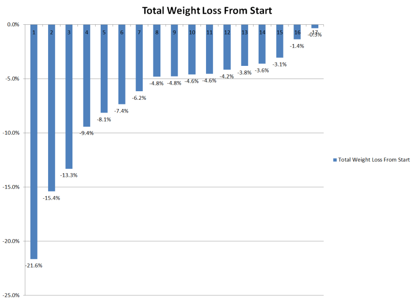 While I was shedding one pound a week, the top tier had lost far more, one person dropped as much as 40 pounds, or 20% of his body weight. The runner up lost 15%. I was in the middle of the pack.