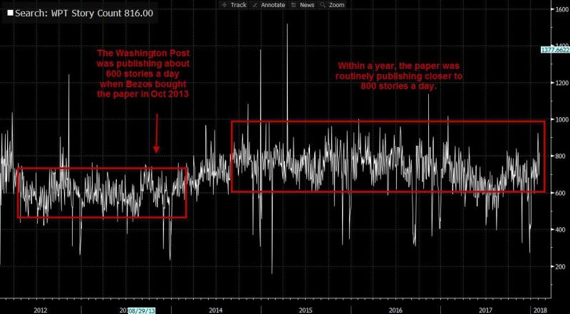 The Bezos effect: Washington Post ramps up the average number of stories published after the 2013 acquisition. #newsbiz #Bloombergdata