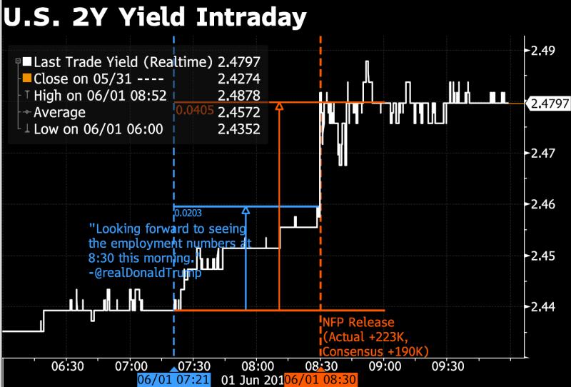 Nice chart from Bloomberg’s @M_McDonough quantifies the impact of Trump’s tweet on the market. Half today’s move in Treasuries occurred after the tweet, but before the jobs numbers were released.