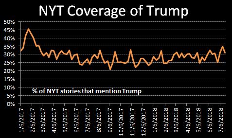 The New York Times may seem like its been increasing its coverage of Trump, but the paper has actually been fairly consistent. Trump is mentioned in about 30% of the paper’s articles and he is the focus (as defined by being mentioned in the headline) of about 8% of the stories.