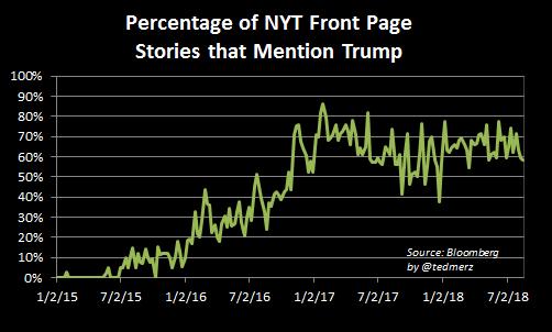 Trump is cited in an astonishing 60% to 70% of the front page articles in the Times on a weekly basis. As the chart shows, the trend even shows signs of increasing in recent months. #newscycle