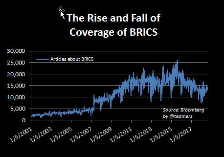 Goldman’s Jim O’Neill coined the acronym BRICS (Brazil, Russia, India & China) in 2001 to track interest in key emerging markets. The number of weekly news articles on Bloomberg surged to a high in 2015. Coverage has since fallen as EM returns have been volatile and lackluster.