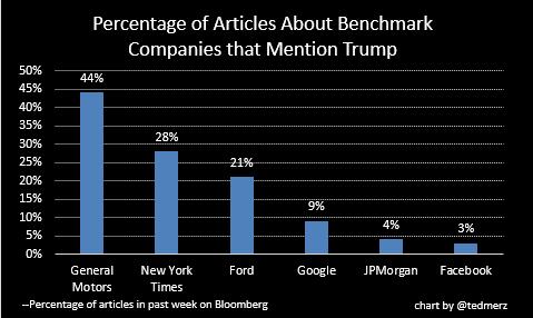 Trump has been vocal in criticizing General Motors for recent layoffs. GM CEO Mary Barra is testifying in front of lawmakers this week. Today’s chart quantifies how much Trump has inserted himself into the GM story by comparing mentions of the president in news articles about the automaker versus other benchmark U.S. companies.