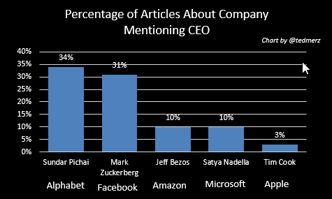 Google’s CEO Sundar Pichai normally flies under the radar screen, getting far less mentions than Mark Zuckerberg or Jeff Bezos. His decision to testify in Congress, spurred a surge in coverage. Pichai was mentioned in more than one third of the articles about $GOOGL that ran on #Bloomberg this week, edging out $FB’s Zuckerberg.