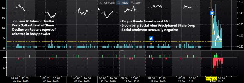 The surge in Twitter activity around J&J today was something you rarely see. A company very few people ever tweet about hit with an explosive story about asbestos in its baby powder product. Social posts exploded, triggering a Bloomberg Velocity alert well before the share price tanked. Sentiment was overwhelming negative.