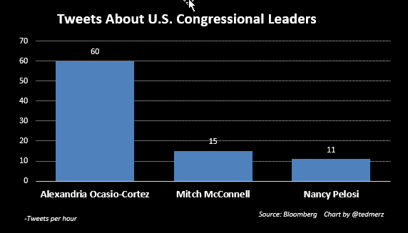 Alexandria Ocasio-Cortez is garnering four times as much social media attention as McConnell and Pelosi. Calculations from #Bloomberg show that today (following a 60 Minutes interview) she is being tweeted about 60 times an hour, versus 15 for McConnell and 11 for Pelosi.