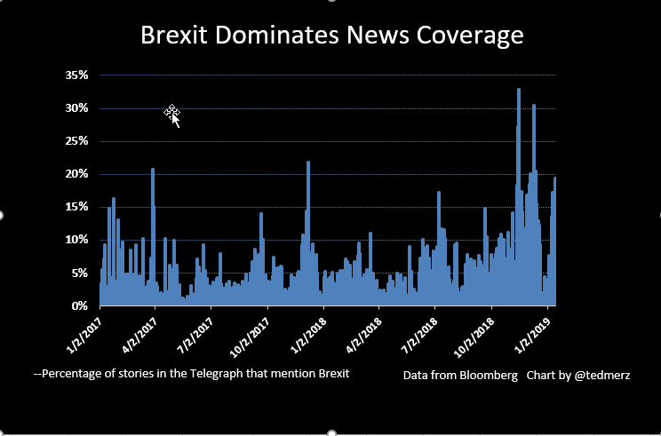 Brexit! Depending on your point of view there is either too much or too little coverage of the U.K.’s decision to exit the EU. If you think coverage is increasing you wouldn’t be wrong. In the chart I show how the percentage of articles in the Telegraph that mention Brexit is running close to 20%.