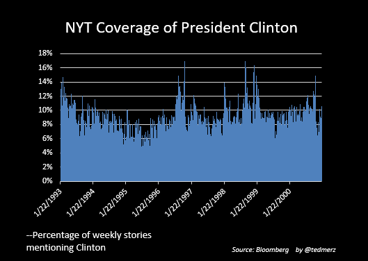 Given the outsized coverage of Trump by the media, I went back to look at how much press the NYT dedicated to previous presidents during their time in office. Clinton tended to fluctuate around 8% of the articles in the paper. That was about the same as where Reagan ended.