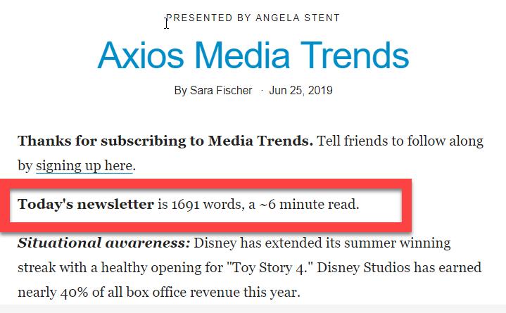 One of the growing product trends you see from newsletters like this one by Axios or articles on Medium is an indication of how long it will take to read.