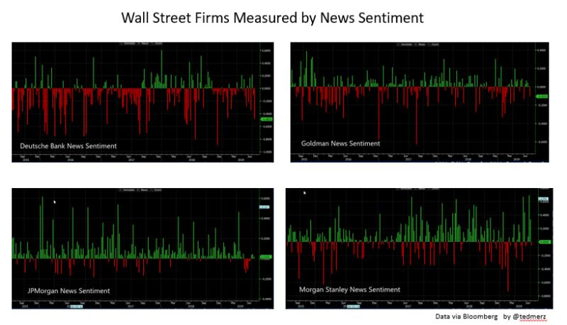 Deutsche Bank’s restructuring prompted me to take a look at how Bloomberg’s proprietary news sentiment algorithm ranked the company versus key Wall Street peers.
