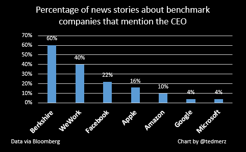 The chart compares the percentage of news stories about WeWork that mention Neumann with CEOs of the six biggest companies in the S&P 500.