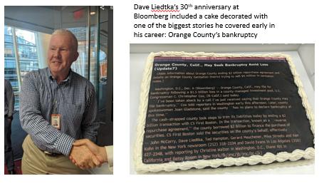Editor Dave Liedtka marked 30 years yesterday. Colleagues in the news department gave him a cake decorated with the lead on the 1994 Orange County bankruptcy story.