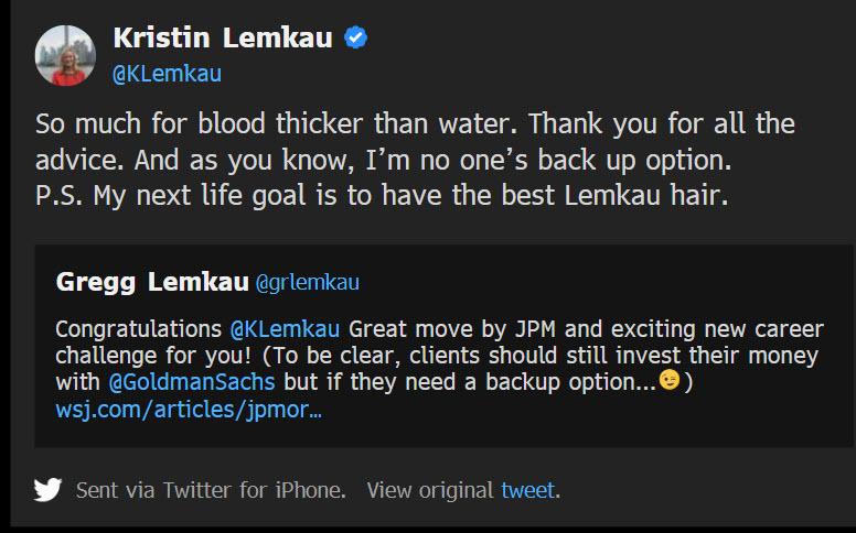 My favorite tweet this week was an exchange between Gregg Lemkau, co-head of investment banking at Goldman, and his sister Kristin, named to oversee a new wealth management group at JPMorgan.