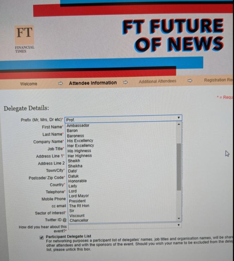 My favorite part of the event occurs now, when you sign up and have to select your “Prefix” among options that include Ambassador, Baroness, His Highness, Sheikh, Datuk, Lord Mayor, Viscount and Chancellor.