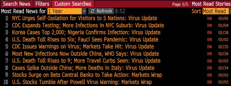 All of the top ten most read stories by Bloomberg clients over the past 12 months occurred since last week. Every one is about the Coronavirus.