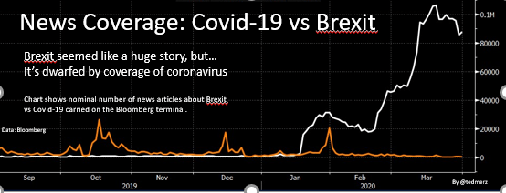 To try, I looked at the volume of news coverage of Covid-19 versus Brexit, arguably the most recent major global story.