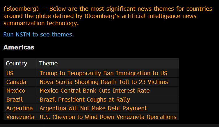 Now, we’ve begun using this technology to generate an automated news article that highlights the biggest “theme” for major countries from the U.S. to Japan. The top item for the U.S. today: Trump to Temporarily Ban Immigration to U.S.
