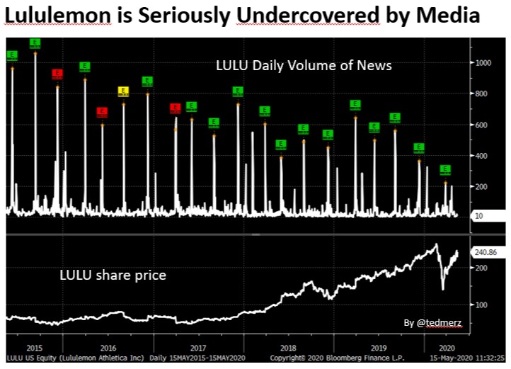To replicate on the Bloomberg professional terminal, type {Chart Daily News Flow LULU <go>}