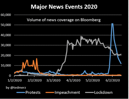 –The Black Lives Matter Protests garnered an extraordinary amount of coverage, but that is slowing. This is a typical “slope” for a news event.