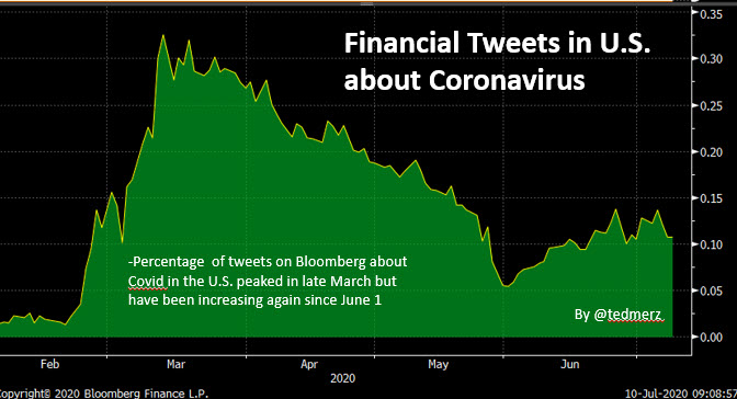 It fell consistently until June 1. At that time 5% of the social media posts carried on Bloomberg about the U.S. focused on coronavirus. Since then it has doubled to more than 10%. Europe has not seen a comparable increase.