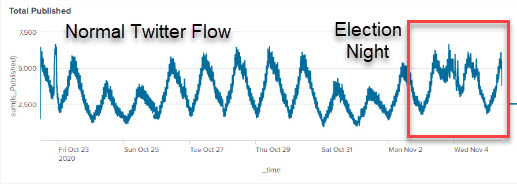 That pattern was disrupted on election night when people didn’t stop tweeting. There was a dip, but people basically posted furiously all night.