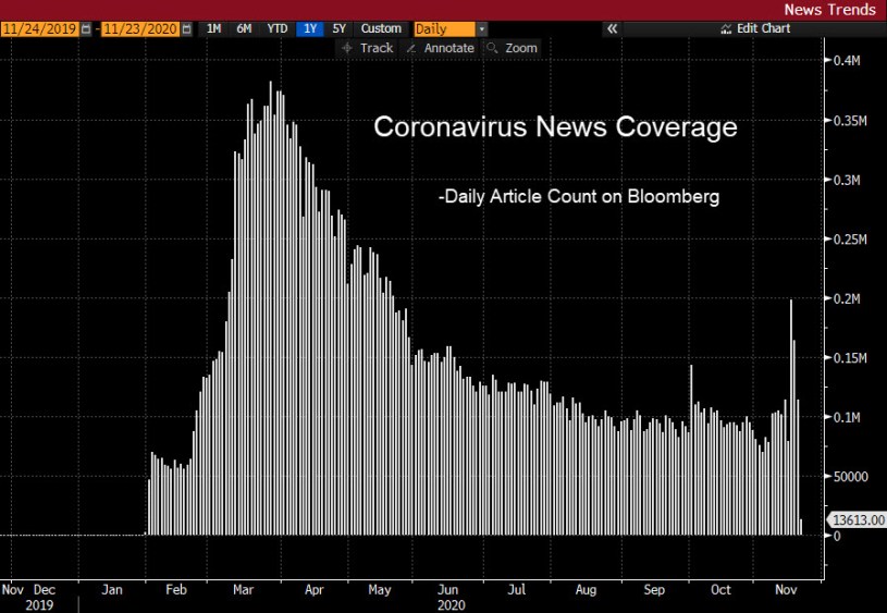 The chart shows the nominal number of daily articles about coronavirus carried on the Bloomberg system.