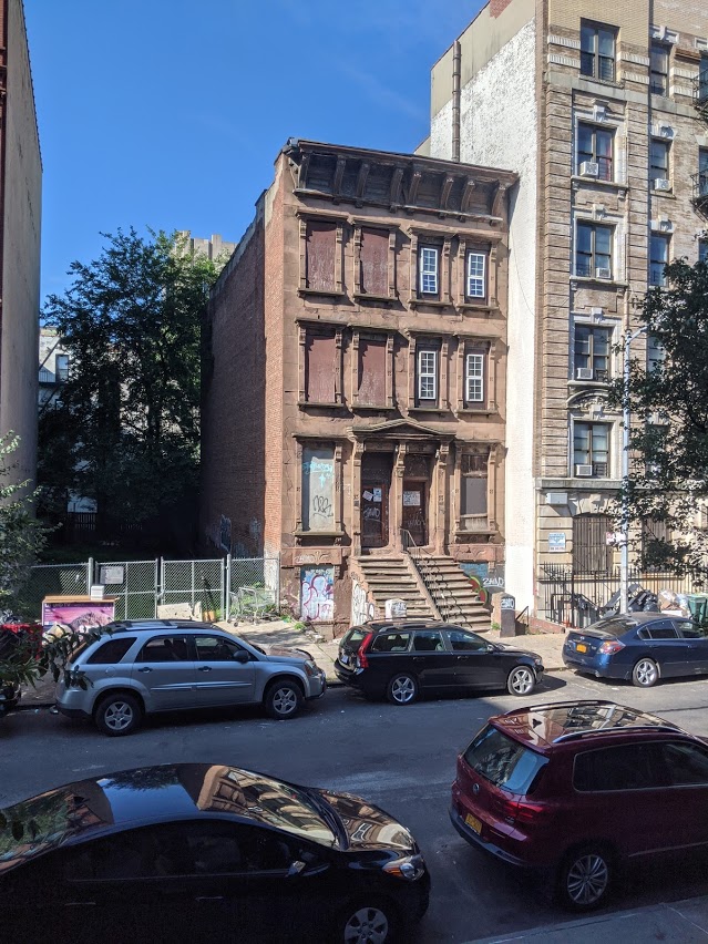 Scaffolding has gone up on a pair of dilapidated townhouses across the street from me, a sign that they will be next.