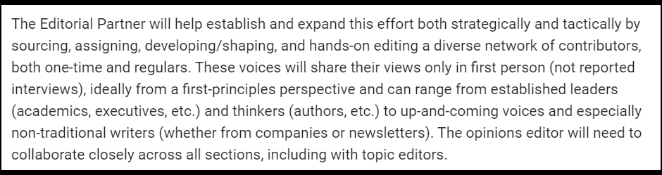 The job description reads like a role at a traditional media company, ie source, assign, develop and edit a diverse network of contributors.