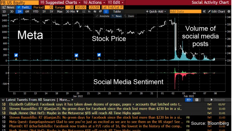 Bloomberg Terminal clients can chart social sentiment by running the GT function. Type {FB US <Equity> GT <go>} and toggle the range to one month.