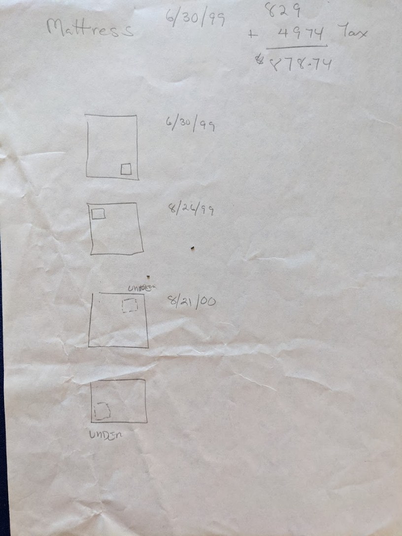 The single sheet included the date (June 30, 1999) and price ($878.74) along with a simple diagram for the position and dates the mattress had been adjusted.