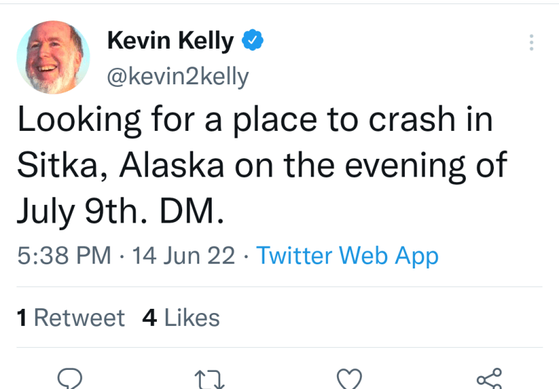 Kevin Kelly, who just turned 70, tweeted recently that he’d be in Sitka, Alaska on July 9th and he’s “looking for a place to crash.”