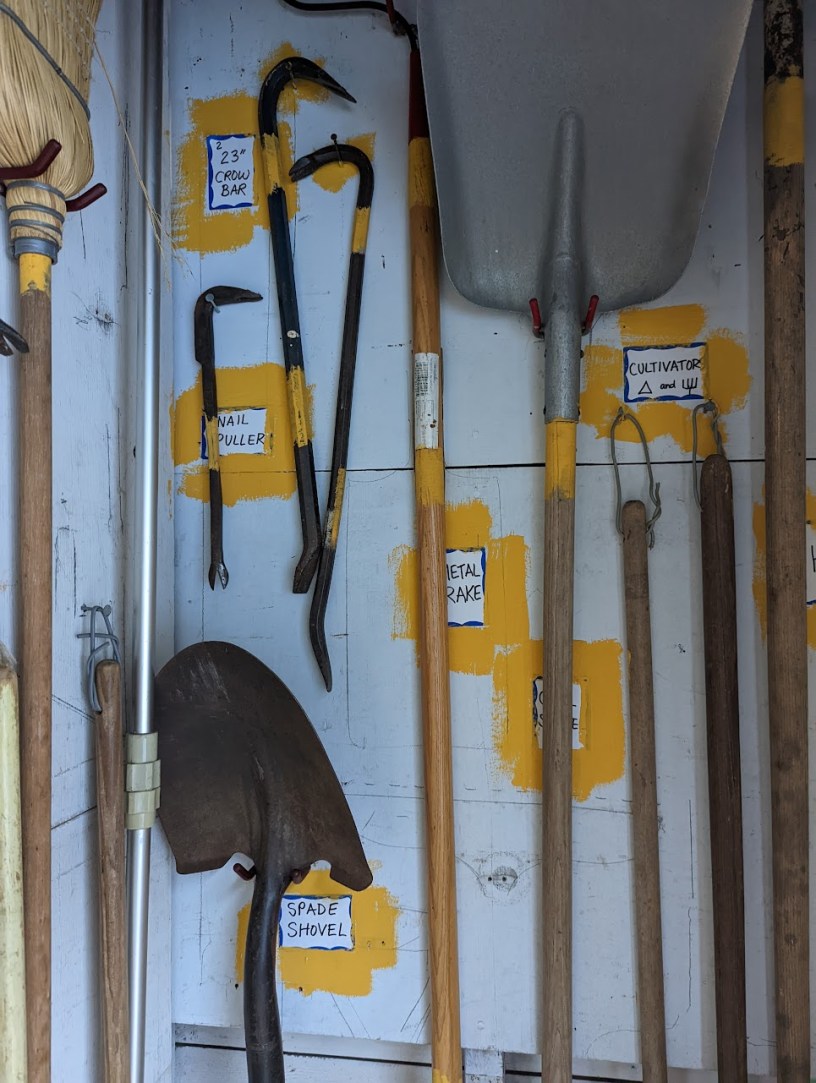 The garage was now festooned with handwritten notes identifying everything from a sledgehammer to a metal rake.