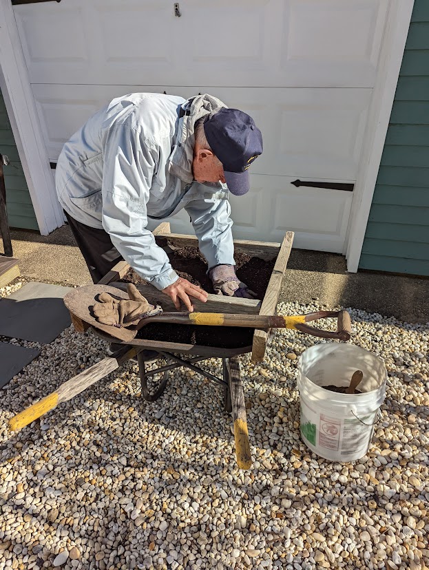 Each winter Dad empties the dirt from the flower boxes onto a large mesh screen atop a wheelbarrow. He pushes it back and forth to filter out the leaves, dead roots and other detritus.