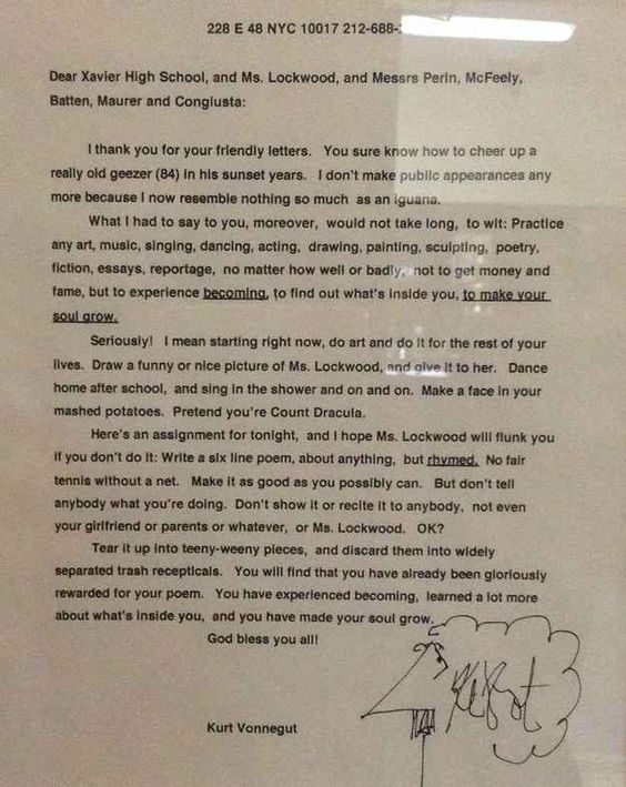 Vonnegut’s response contains neither foreboding nor woe. It’s light and playful. He tells the students to: