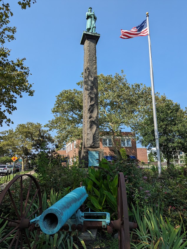 A statue of a soldier from New Jersey’s 14th Regiment stands at parade rest atop a tall stone pillar flanked by two cannon. It was unveiled on Memorial Day 1893.
