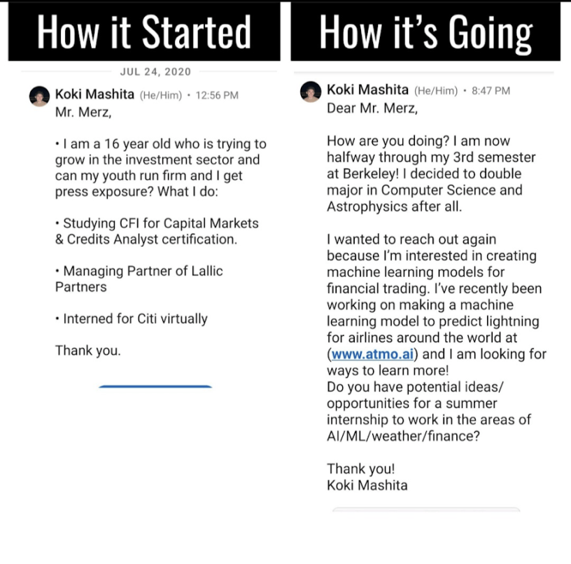 For the past three years, Koki has asked me for career advice and shared his journey.