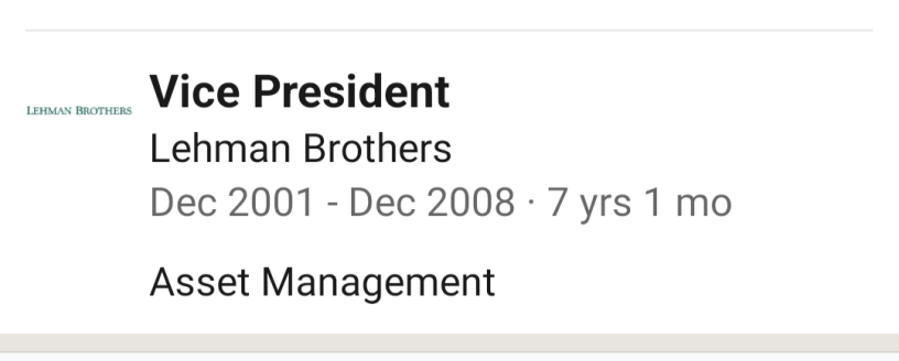 It’s a snippet from a LinkedIn bio of a friend of mine. We had coffee recently and I noticed his first job after college in 2001 was with Lehman Brothers. He worked there until December 2008.