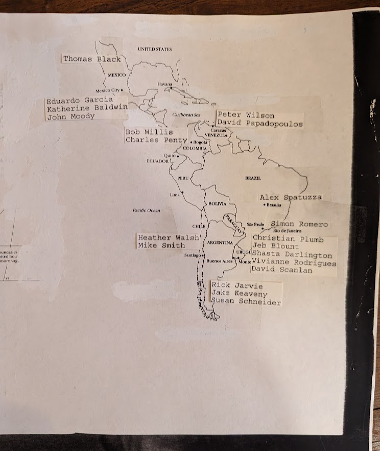 To keep track of everyone, I printed out a map and cut and pasted the names of the journalists next to each country. (Canva didn’t exist yet!)