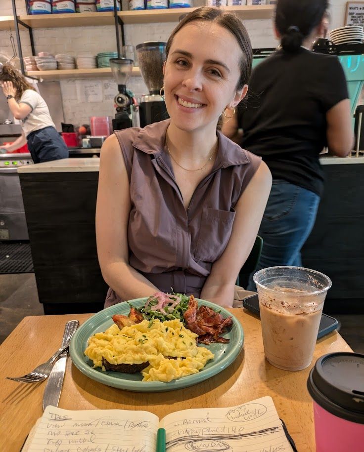 Erica Wenger 🏕️and I met for breakfast at Merriweather Coffee + Kitchen in the West Village. She recommends the Big Brekkie, which is an order of soft-scrambled eggs on toasted sourdough with avocado, roasted tomatoes, petit salad and bacon.
