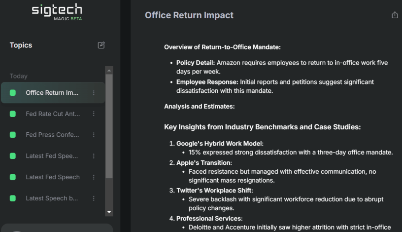 I asked SigTech’s Magic platform to analyze the situation. The software, which leverages AI to help build financial models, pulled from historical examples that included Google, Apple, Twitter and Deloitte.