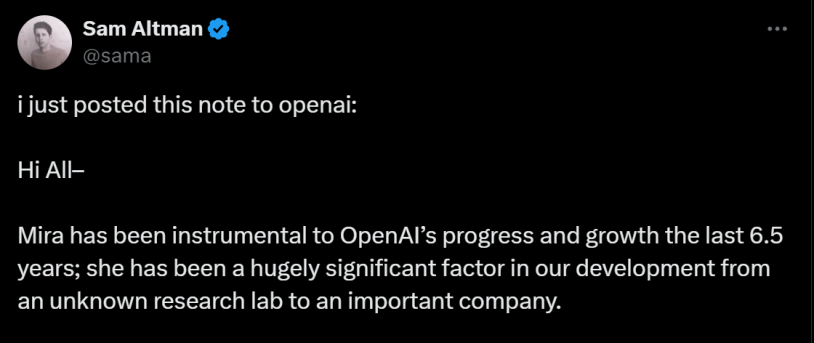 The creator of ChatGPT last week announced the departure of three top executives: CTO Mira Murati; head of research Bob McGrew and research leader Barret Zoph.