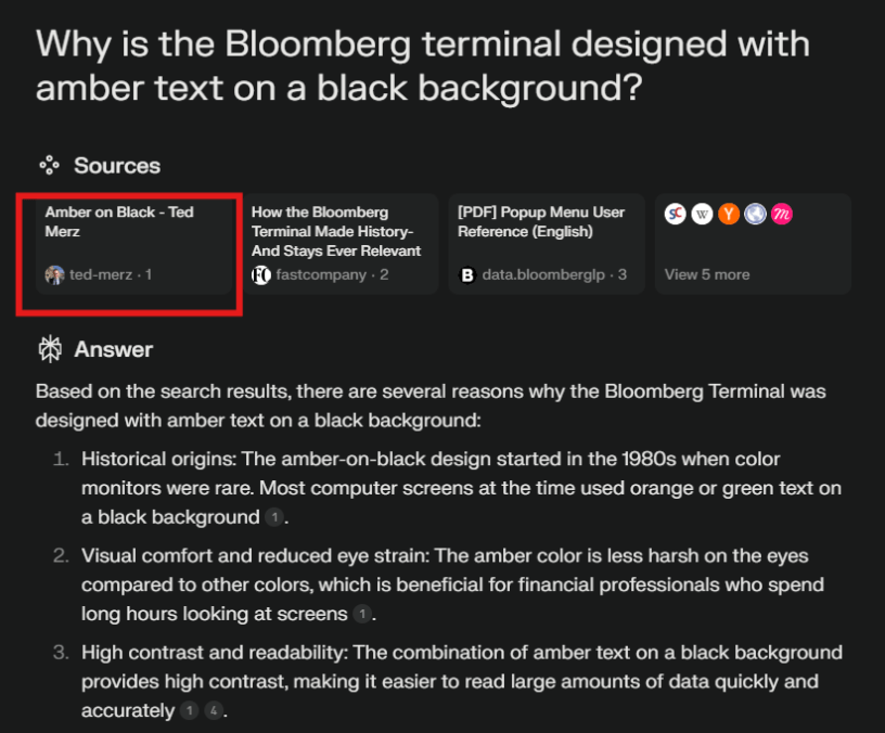 Perplexity came back with eight solid explanations, including the fact that amber and green were default computer monitor colors when Bloomberg started in the early 1980s.