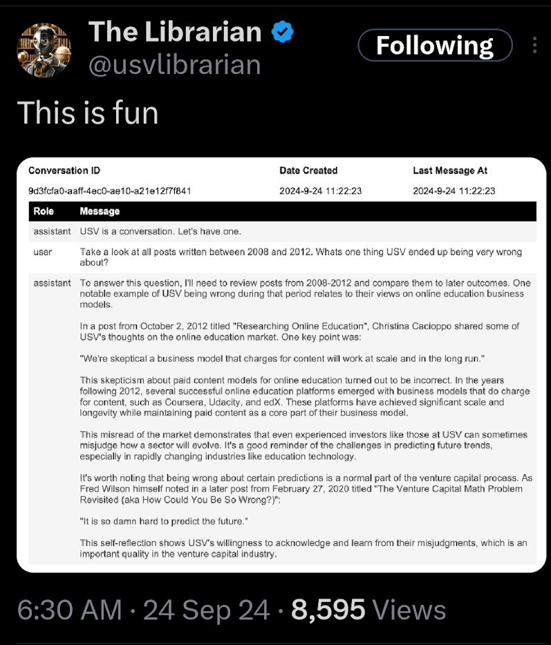 Matt Cynamon, head of library sciences at Union Square, recently shared on Dan Shipper’s podcast that the firm has created a database of 15,000 articles from its blog.