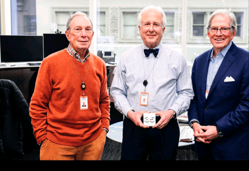 Last week, Mike Bloomberg, Peter Grauer and dozens of colleagues surprised Matt at his desk with cupcakes to commemorate the occasion. He was awarded a lucite trophy marking 35 years, one of relatively few employees to reach that milestone.