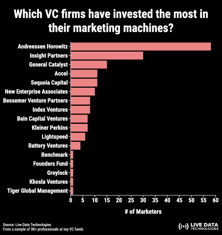 As the accompanying Live Data Technologies chart illustrates, A16z spends more hiring marketing talent than any other VC firm.