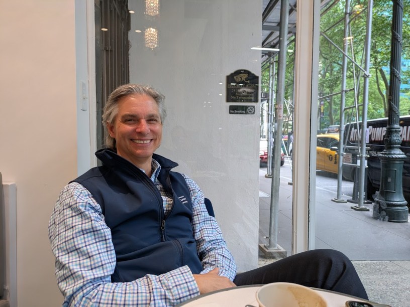 I met up with David Hughes, who runs investor relations, marketing and strategic development at Mill Hill Capital, at Lady M near Bryant Park. He had the chocolate cake; I had the signature Mille Crepes.